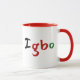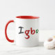 Uma caneca colorida Igbo Pan African, esta design apresenta "Igbo" exibido em preto, vermelho e verde. O dentro da caneca apresenta vermelho com uma alça vermelha correspondente. Personalize o seu hoje!