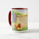 Esta caneca lindamente desenhada captura um momento tranquilo e cheio de fé no campo, inspirado em João 15:5. Com uma galinha gentil e seus pintinhos aninhados ao lado de uma videira florescente com uvas roxas ricas, esta obra de arte reflete a beleza de permanecer em Cristo, a verdadeira videira.