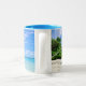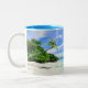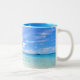 Uma caneca com interior azul e um impressão tropical do mar, da areia/praia, das árvores e da palmeira no exterior. O texto lê: "Relaxe e aprecie o melhor da vida."