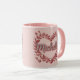 Esta caneca apresenta um design decorativo de nome com o nome Michelle em escrita prateada brilhante centrada dentro de uma moldura em forma de coração. A moldura é criada por elementos em forma de coração em dourado rosado metálico e folhas em um padrão circular. Os corações são brilhantes, criando um efeito dimensional contra o fundo rosa suave. Pequenos pontos e folhas em dourado rosado estão no design. Os corações na moldura são maiores e mais proeminentes e corações menores estão ao redor do perímetro do design. A paleta de cores consiste em tons de rosa e dourado rosado, criando uma estética romântica e elegante. O fundo é uma cor rosa claro sólida que complementa os elementos metálicos. O design tem uma estética feminina e de Dia dos Namorados com seus motivos de coração e paleta de cores suaves.