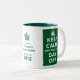 Uma caneca com uma paródia do poster 1939 da informação pública do governo que carrega as palavras "mantem a calma e toma o dia livre" no texto branco.