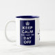Uma caneca com uma paródia do poster 1939 da informação pública do governo que carrega as palavras "mantem a calma e toma o dia livre" no texto branco.