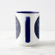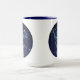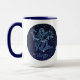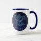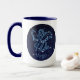 Mug que apresenta o símbolo do zodíaco de Virgo em azul-prata-mole, como medalhão-redondo, sobreposto às estrelas da constelação, contra um fundo do céu estrelado formando do azul-da-meia-noite ao preto.