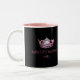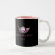 Um impressão cor-de-rosa brilhando da coroa poised a parte dianteira e o centro em cada lado desta caneca do café/cacau. Mostrado em uma caneca preta & branca com um texto cor-de-rosa interior e coordenando cor-de-rosa. Personalize seu interior e personalize o texto da amostra ao seus próprios. Mostrado como a senhorita Des Moines 1982.