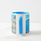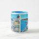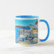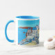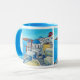 Pintura vibrante e estilizada do lindo Santorini, Grécia com sua majestosa cúpula azul pela artista popular Lisa Lorenz numa caneca.