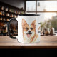 "Corgi sorri para consertar tudo" declara esta caneca fofa para o dono do cão Corgi. A imagem em cada lado é um adorável cão Corgi vermelho e branco.
