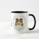 "EU AMO MEU SHETLAND SHEEPDOG" declara esta caneca para o dono do cão Sheltie. Cada lado da caneca tem um retrato de um adorável Sheltie cercado por folhas de eucalipto verde suave em aquarela. Entre as duas imagens está o texto, que pode ser facilmente personalizado, ou até removido por você, e seu monograma ou nome.