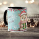 Nesta caneca, uma rena fofa está vestida com seu chapéu de Papai Noel e cachecol. Ele tem um pacote de presente de Natal. A imagem é colocada sobre um fundo sutil floco de neve azul e branco. No topo e no fundo estão bordas de confete vermelho. O texto vermelho em ambos os lados diz "FELIZ e BRIGHT", e o nome do seu filho está em cinzas no fundo de um lado. Bonita para crianças de todas as idades!