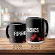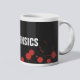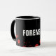 Caneca preta com texto personalizado "FORENSICS". Manchas de sangue. Cor de fundo personalizável.