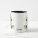 Um belo retrato de aquarela de um cachorro preto e bronzeado do Cocker Spaniel emerge de um buquê vermelho e rosa-escuro nesta caneca. Por trás da imagem do cão está um spray de confete de ouro. A imagem aparece em dois lados da caneca, com seu nome em preto entre eles. Se preferir, você pode remover o texto limpando o campo modelo.