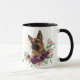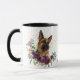 Um belo retrato de um Cachorro German shepherd emerge de um buquê vermelho e rosa de um creme nesta caneca. Por trás da imagem do cão está um spray de confete de ouro. A imagem aparece em dois lados da caneca, com seu nome em preto entre eles. Se preferir, você pode remover o texto limpando o campo modelo.