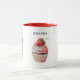 Uma caneca com uma ilustração brilhante com um cupcake delicioso. Sorvete branco e um morango grande adoram este doce doce doce.