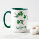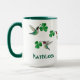 Cute mug with hand-painted ruby-throated hummingbirds carrying shamrocks. Just add your name!