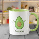 Uma caneca engraçada com uma ilustração fofa de abacate no estilo de desenho animado e um texto personalizável abaixo: perfeita como presente para um amigo ou para o seu café no trabalho!