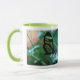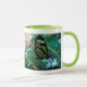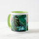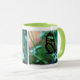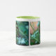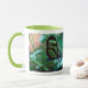 As máscaras etéreos da turquesa e o verde desta foto da borboleta, impresso em ambos os lados da caneca, criam uma impressão original em uma caneca com um punho do verde limão.