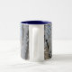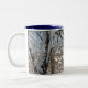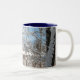Esta caneca mostra uma cena do inverno com ramos de árvore cobertos de neve diretos visíveis da construção.