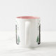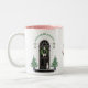 Um cão doce de Boston Terrier que veste um laço e uma posição cor-de-rosa em um pátio de entrada coberto decorado para os feriados, caracterizando árvores de Natal com as estrelas que flanqueiam a porta preta elegante, uma grinalda do pinho com arco cor-de-rosa do guingão, e lanternas cobriu com rosas e azevinho. Ao estilo de elegante clássico moderno da casa da quinta | da magnólia |. Personalize o centro com a foto do seu cão adorável e o nome no centro da caneca.