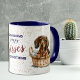 "Dachshund puppy kisses conserta tudo" declara esta caneca para o dono do Dachshund. A imagem em cada lado é um retrato de um filhote marrom adorável de Dachshund em uma cesta mais vadia. As imagens e o texto são colocados sobre um fundo branco que é aspergido com um confete dourado.