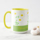 Caneca de café amarela, realçada com verduras, com uma impressão de margarida branca fresca. O texto pode ser personalizado para sua própria mensagem inspiradora, ou o texto pode ser removível. Lindo ideia personalizada de presente.
