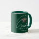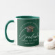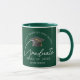 This modern dark green custom senior graduation mug features your high school or college name for the class of 2026. Customize with your graduating year under the chic handwritten script and grey grad cap for a great personalized graduate gift.