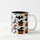 Uma caneca festiva de Halloween com um padrão lúdico de jack-o-lanternas, morcegos, bruxas e estrelas. Perfeito por adicionar um pouco de charme assustador às suas comemorações de Halloween.