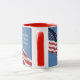 Caneca vermelha, branca e azul com bandeiras americanas. Um lateral tem "deus abençoe América" e o outro lado tem "a terra do livre e a casa do bravo." Mostre seu patriotismo com esta caneca da bandeira americana! Obtenha um grupo de harmonização para todos na casa ou no escritório. Beba seu chá ou café desta caneca colorida de América dos deus abençoe.