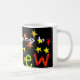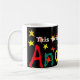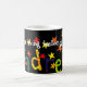 Uma caneca branca clássica para alguém chamou Andrew com uma colagem de papel pintado à mão do nome, Andrew, polvilhado com as estrelas vermelhas e amarelas, em um fundo preto.