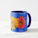 Minha arte digital original com a minha fotografia original de três flores Gerbera, em amarelo e vermelho, está nesta linda caneca de xícara floral. A imagem foi processada com um efeito de fantasia de aquarela para uma aparência ilustrada e caprichosa. O interior da caneca e da alça são em um tom azul para complementar a obra de arte. São canecas de 325 ml, exatamente o tamanho perfeito para o seu café ou chá caseiro - ou até mesmo chocolate quente! Faria um ótimo presente e você pode colocar pacotes de café, saquinhos de chá ou chocolate quente dentro. Outra ideia de presente é colocar uma pequena planta nela para torná-la ainda mais especial para o seu ente querido. Também faria um lindo presente para o Dia das Mães.