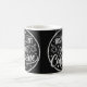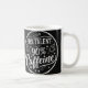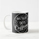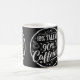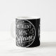 Um design de tipografia circular branca em um fundo preto declara humoristicamente a criatividade como alimentada por cafeína. Ilustrações de xícara de café adicionam charme.