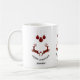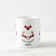 Uma caneca personalizada que diz "Feliz Natal" em texto curvo. Projetado com uma ilustração de 2 cervos de Natal saltando. Os cervejeiros são feitos de xadrez vermelha e preta, com um pouco de coração entre eles. As decorações de natal de xadrez vermelha e preta penduram no topo.