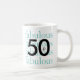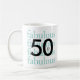 Comemore seu aniversário de 50 anos com uma caneca na moda personalizada apresentando um grande preto "50" sobre a palavra "fabuloso" repetido 4 vezes em texto fino claro em cada lado. Um pequeno e preto está encaixado no zero de cada cinquenta.