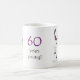 Esta caneca branca, com lábio azul escuro e maçaneta faz um presente de excelente aniversário para uma criança de 60 anos! A imagem, para trás e para a frente, é de um 'homem mais velho' dançando, em um chapéu de blazer e boater, a partir de uma ilustração de aquarela de Judy Adamson. Entre os dois homens está o texto - 60 anos de idade!
