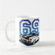 Um Camaro projetado preto e branco senta-se na frente de um número azul 69 que diz o mundo que você é um fã deste grande carro americano do músculo.