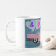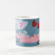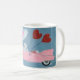 6 7 is in the clouds as this Poodle doggie is flying in the sky in a pink convertible classic car with heart balloons and roses in the back seat. A whimsical and fun mug!