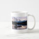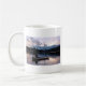 Uma vela-canoa deriva perto enquanto as nuvens graciosas reclinam sobre montanhas distantes.