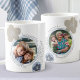 Caneca de fotos personalizada com flores de pop de abstrato e design de pintura em bege neutro, azul e cinza. Todo o texto, que enquadra suas fotos, é totalmente editável e atualmente lê "tenha um dia excelente. ame [seu(s) nome(s)]" de um lado e "felicidade é ... ter você como nossa avó" do outro lado. O modelo de foto está configurado para que você adicione 2 de suas fotos favoritas (ou você pode colocar a mesma foto em ambos os lados). Um presente adorável para qualquer ocasião como um aniversário ou dia de as mães e fácil de personalizar para sua mãe, avó, amiga etc.