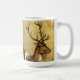 This vintage-style holiday mug features a classic illustration of Santa Claus dressed in a traditional long red robe with white fur trim, carrying a sack overflowing with dolls and toys over his shoulder. He stands alongside a large reindeer, holding its leather bridle against a textured, gold-colored background. The scene is framed along the bottom by festive boughs of holly with red berries and mistletoe with white berries,