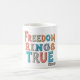O design de t-shirt apresenta a frase "Freedom Rings True" numa fonte vibrante e multicolor. As cores são ousadas e chamativas, criando um sentimento dinâmico e enérgico. A design é moderna e minimalista, com o texto centrado na camisa. A estética geral é inspiradora e estimulante, celebrando o conceito de liberdade.