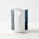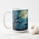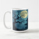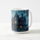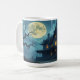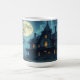 Uma casa assustadora e assombrada debaixo de uma lua de cheio, com árvores assustadoras ao seu redor, faz uma linda caneca de Halloween.
