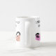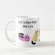 Uma caneca engraçada, com cinco gatos coloridos, ao redor do fundo da caneca. No topo da caneca está uma citação dizendo "A vida é perfeita com gatos" em letras negras. Um design adorável e adorável perfeito para amantes de gatos.