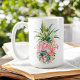 Um abacaxi alegre em pinças aquáticas, verdes e amarelos com flores tropicais e folhagem cobrindo o abacaxi no estilo havaiano. O texto original cor-de-rosa enuncia a palavra "Aloha". Mostrada aqui em uma caneca do tamanho de 15 oz, esta design também está disponível em uma caneca de 11 oz.