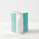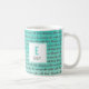 Um fundo de cor d'água turquesa com o tipo de script repetitivo "Abençoada é a mulher que anda com Deus". Certifique-se de personalizar esta caneca com seu nome e inicial. Faz um presente excelente para qualquer mulher cristã que ama Deus!