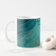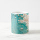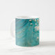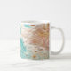 This image presents an abstract, topographic-style depiction of an ocean landscape. The left side features swirling patterns in shades of blue and turquoise, resembling deep water currents. Moving towards the right, the colors transition to warmer tones of beige and light brown, suggesting a sandy shoreline.