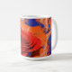 A caneca de café artística apresenta o moderno AI gerado abstrato digital marmoreado vermelho e rosa laranja no cheio florado em fundo azul.