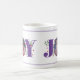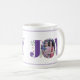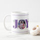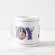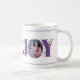Alegria Roxa com bagas, caneca de café com foto de Natal. Mostra a palavra "JOY" em roxo com bagas vermelhas e verde enquanto em vez da letra "O" está sua foto.