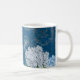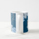 Alice no País das Maravilhas, com a citação do livro, Curiouser e curiouser, chorou Alice, com borboletas, lindas hipórnias azuis e brancas, um relógio de bolso vintage, e escrevendo e marcos de uma antiga carta francesa são colocados sobre um fundo azul marinho cobalto profundo com bonito letra de mão e texto de um recibo compre francês vintage. Uma bonito e nostálgica caneca de café com tema floral e francesa.
