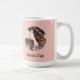 Esta adorável design mostra uma imagem de Art Nouveau de Alphonse Mucha de uma mulher com cabelos fluidos e uma garland de flores de rosa claro contra um fundo cor-de-rosa pêssego. Mucha criou uma bela arte, muitas vezes para posters, de mulheres e flores em trajes floridos com cabelo gracioso e sinuoso. Esta imagem de dominio público faz parte de sua obra chamada Vitril pour la façade de la boutique Fouquet Vlll. Esta imagem aparece na frente e atrás da xícara. Escreva o seu nome na seção Personalizada ou elimine o texto do marcador de posição se não quiser texto com a imagem.