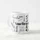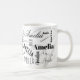 A stunning typography custom name mug featuring the name "Amelia" in a variety of elegant type styles. The initial script artfully overlaps in the background, creating a harmonious design. This coffee cup showcases a simple yet striking color palette of black, white, and grey, ensuring that nobody can mistakenly take your coffee. The name declares ownership boldly.