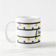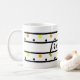 Amigos são escritos no centro de canecas em uma elegante escrita preta. Formas geométricas coloridas com faixas pretas e bolinhas laranja e amarelas sobre fundo branco. Personalize com seu texto Inicial Monograma ou outro texto mostrado em texto preto ou exclua. Formas circulares brilhantes e divertidas. Design de arte original © TamiraZDesign. www.zazzle.com/tamirazdesigns