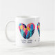 Um design de coração colorido cheio de motivos de pena abstrato simboliza amor e pureza. O trabalho de arte combina matizes brilhantes e padrões geométricos, fazer ideal para uso em roupa, acessórios, canecas ou decoração.